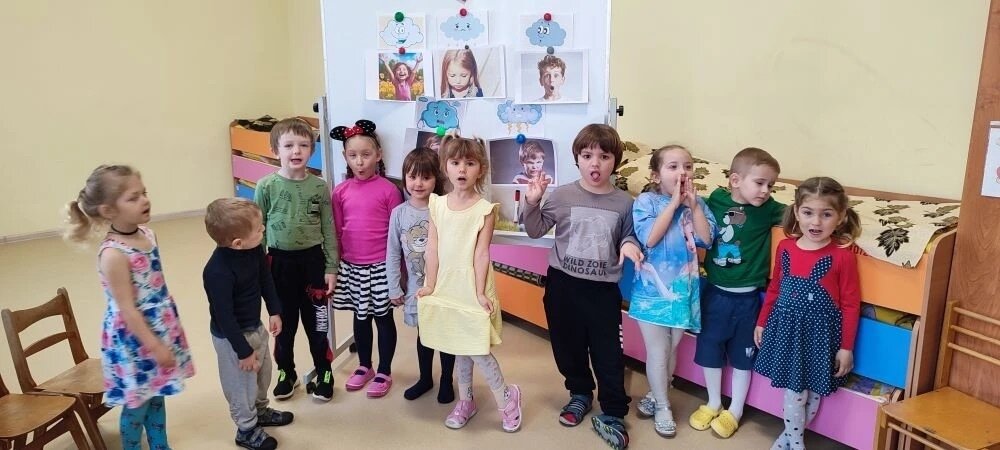 Педагог-психолог Новикова Виктория Андреевна продолжает знакомить детей с эмоциями. Детям очень нравится изображать разные эмоции, угадывать эмоции друзей и просто весело играть.